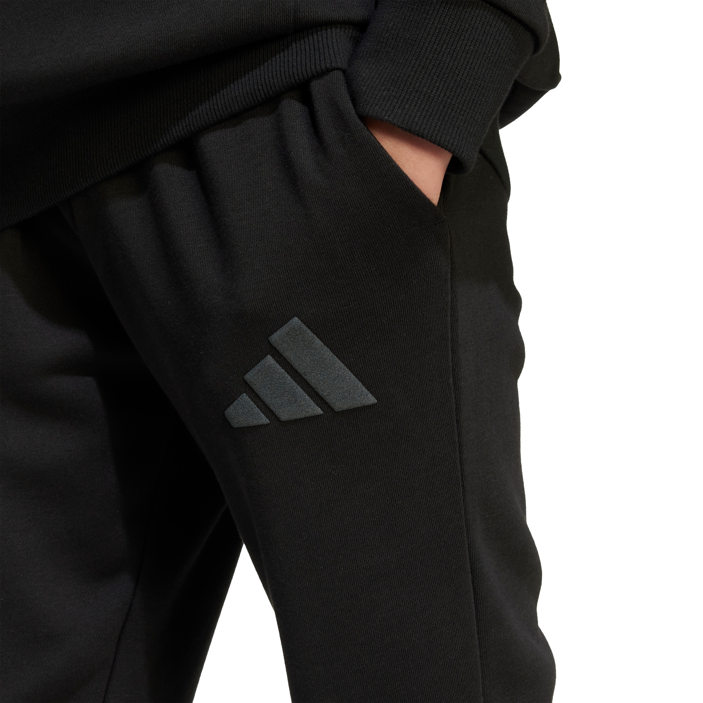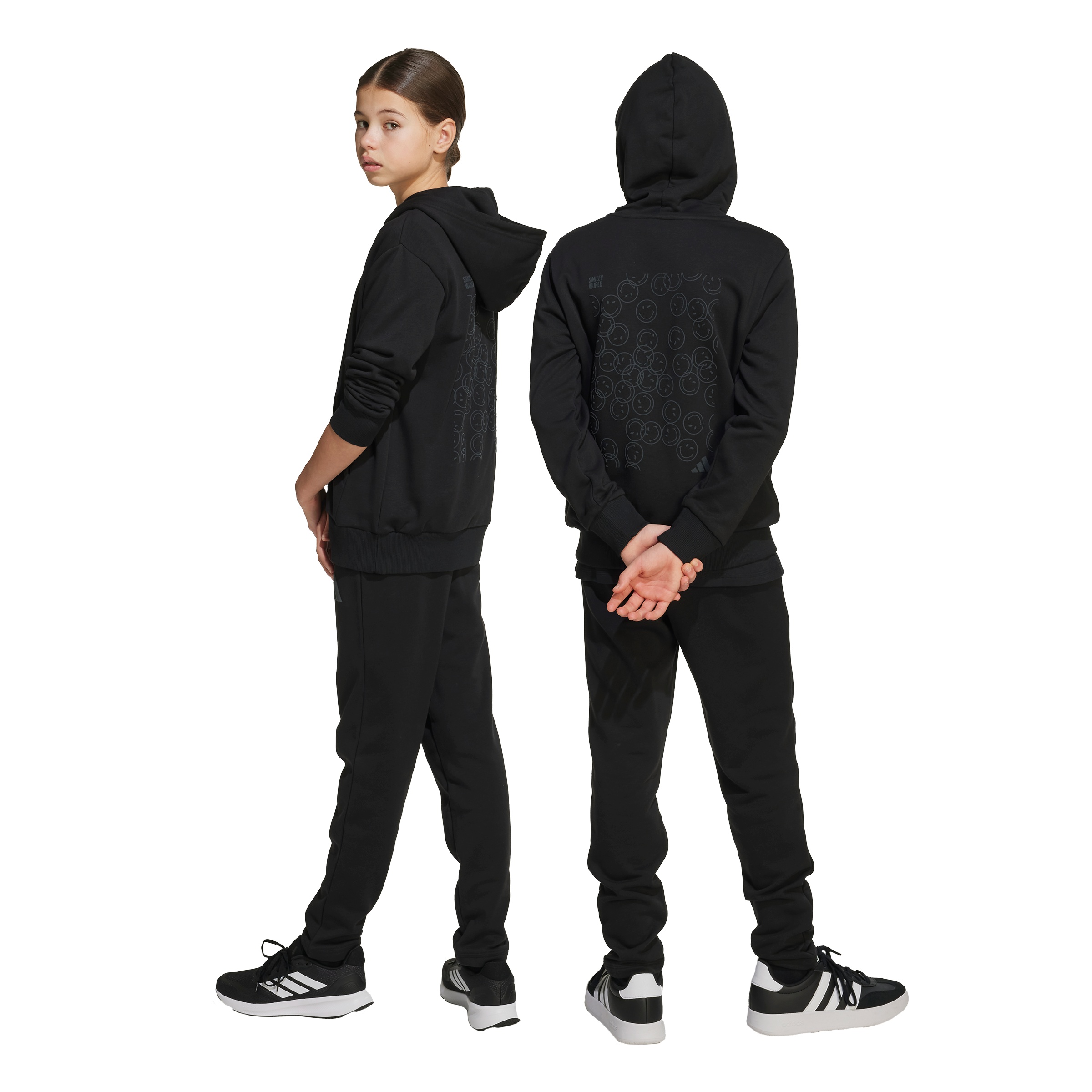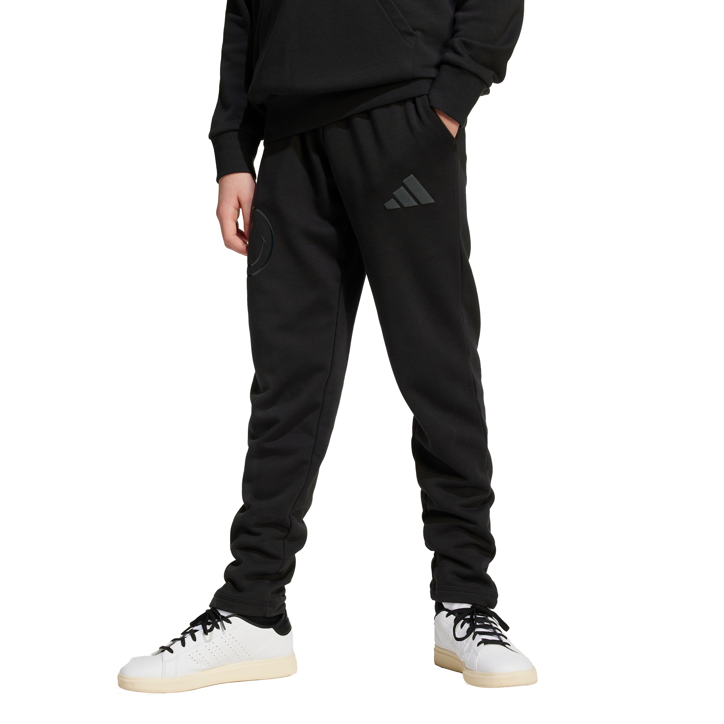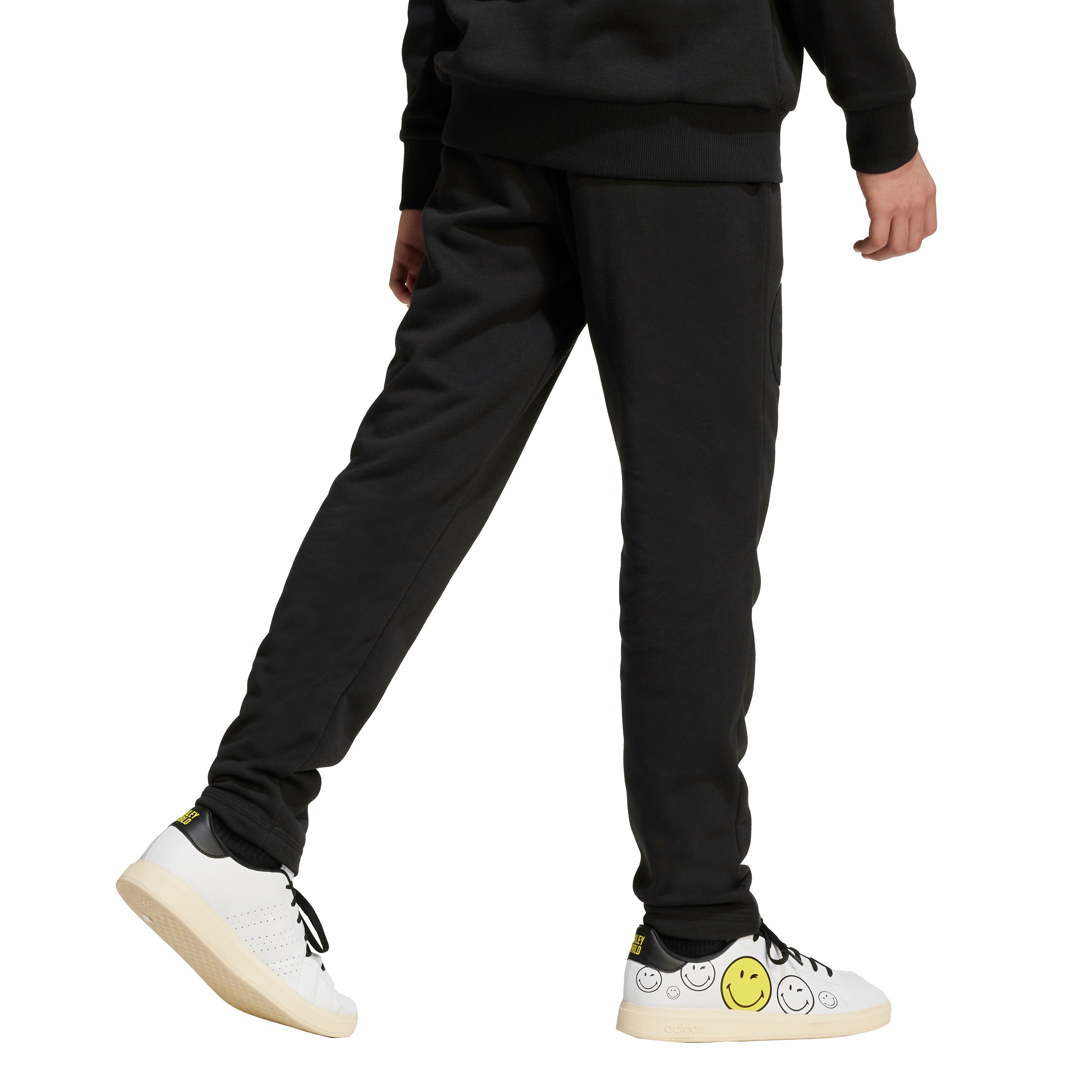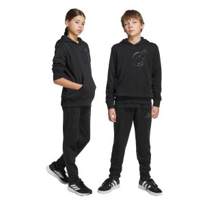 Brighten up your junior’s wardrobe with the adidas x SmileyWorld pants, a delightful collaboration designed to spread happiness. These regular fit pants, made from a blend of cotton, recycled polyester, and viscose, feature a unique glossy smiley graphic and a soft suede print 3 bar logo. With a comfortable knit construction and a drawstring closure, these pants are perfect for everyday wear, combining playful design.