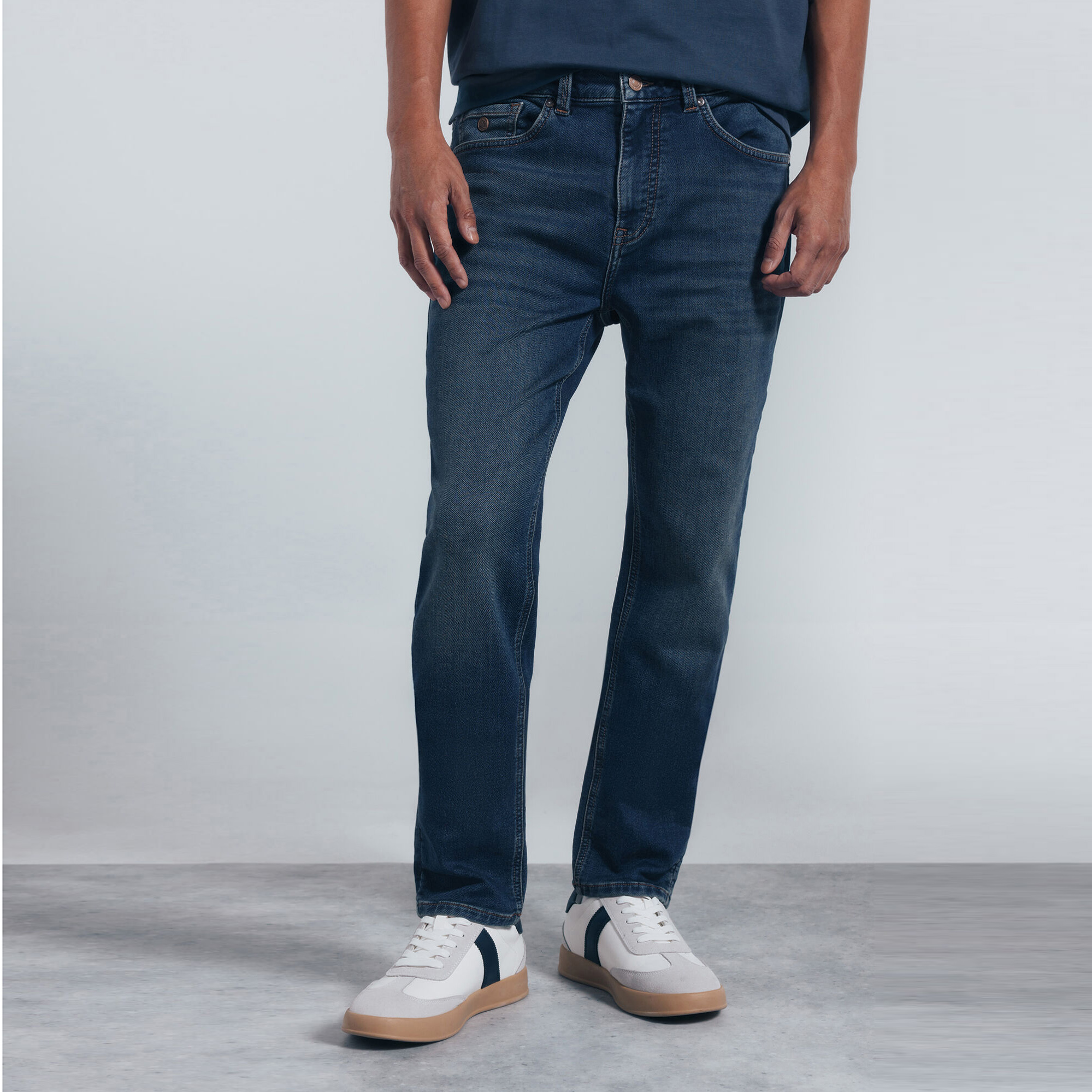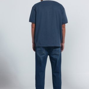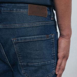SLIM 5 POCKETS DENIM KNIT DIRTY DARK WITH WRINKLES ON THE FRONT.